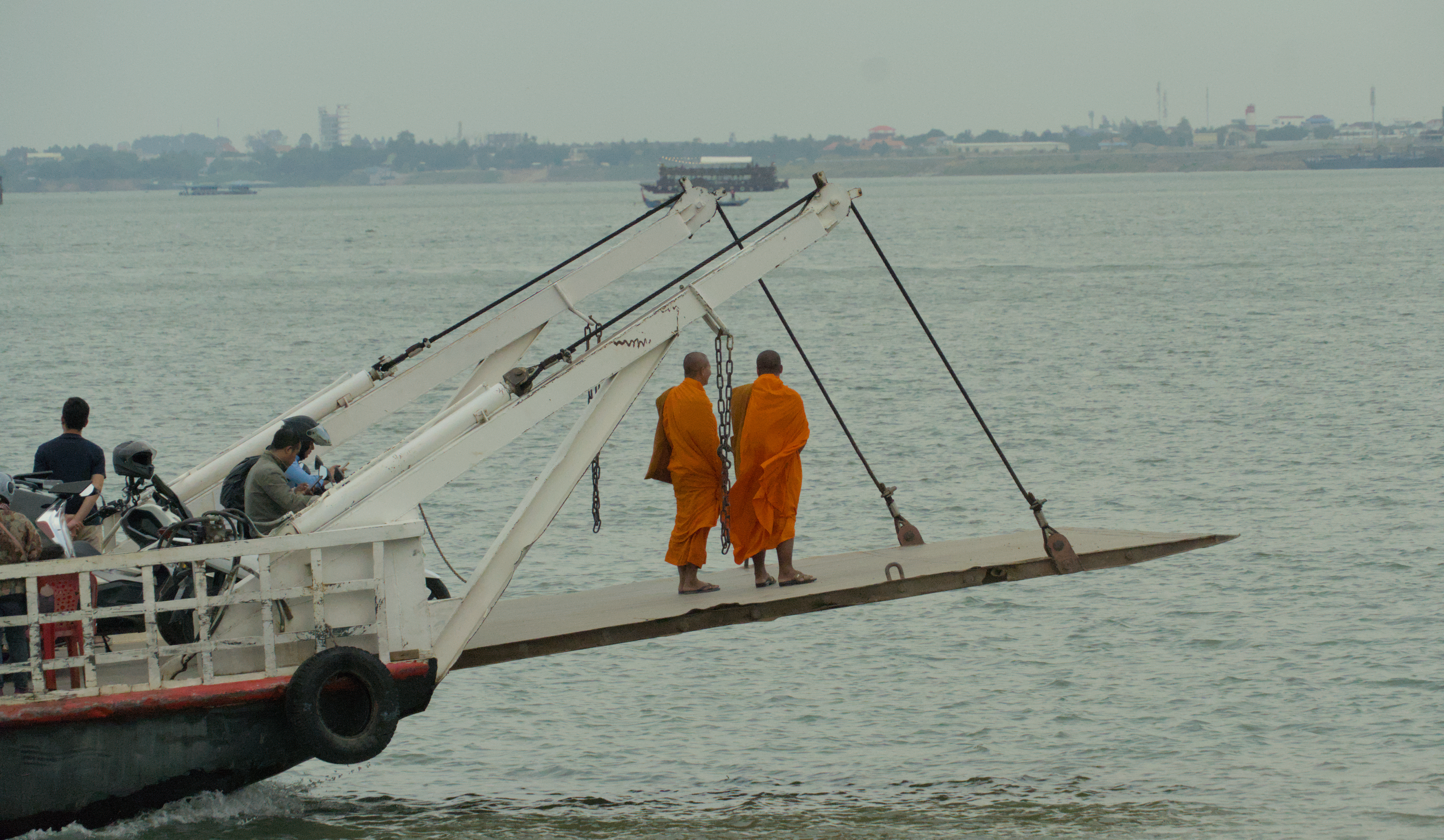 Two monks about to disembark the ferry in Phonm Penh, Cambodia